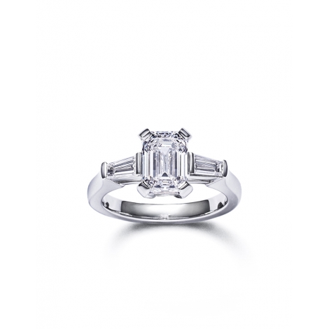 Tapers Ring in 18k white gold, set with two diamonds, tapers cut, for a total weight of 0,52 carat and with a central diamond, emerald cut, of 2 carats, shiny finish.