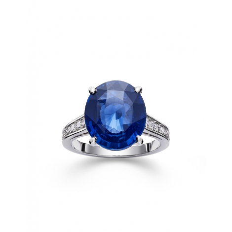 Bague Médicis or blanc 18kt, sertie de diamants sur le corps de bague pour un poids total de 0,21 carat et d'un centre saphir naturel, taille ovale de 8,03 carats, finition brillante.